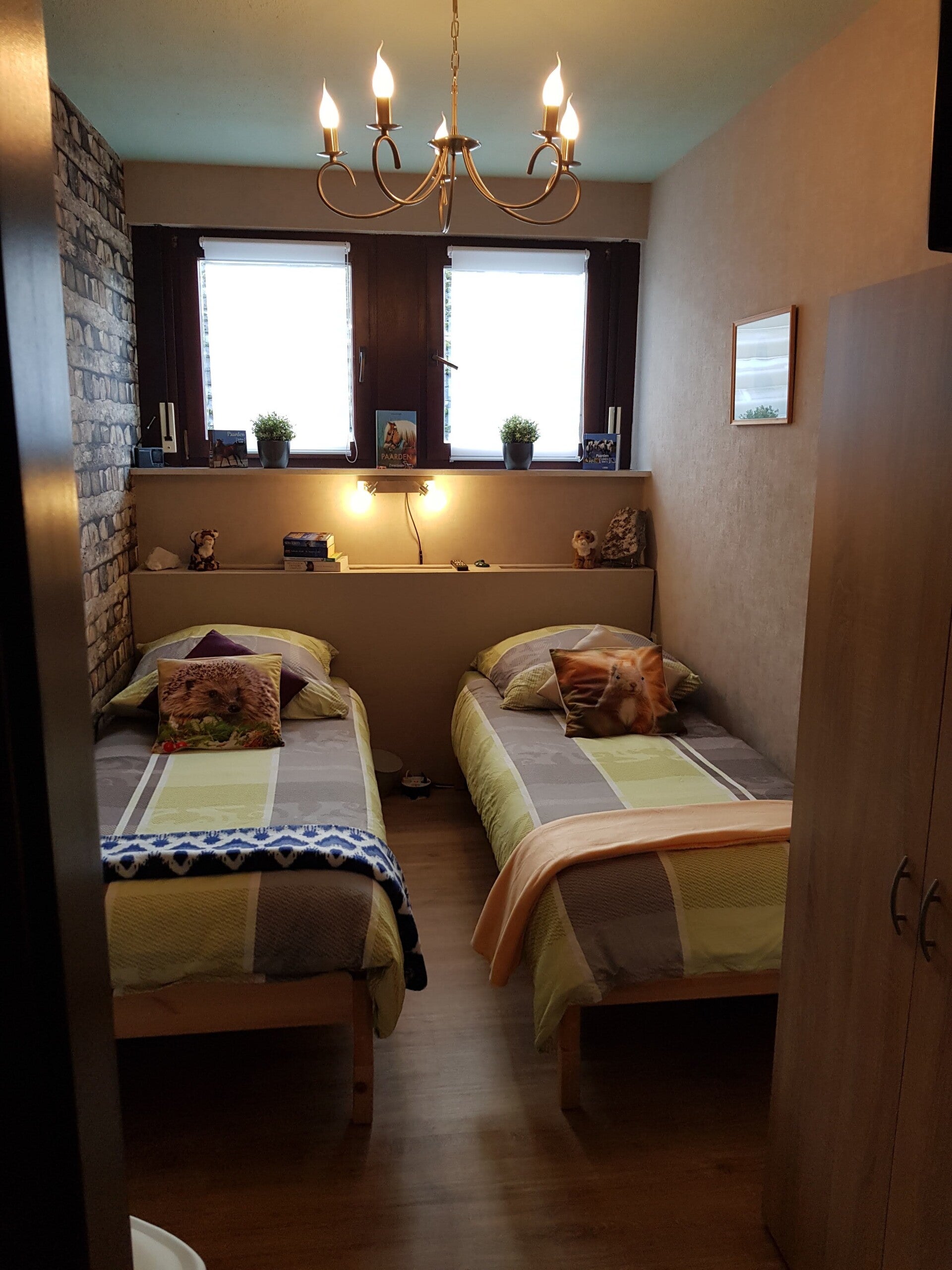 Foto 3 Das geräumige Schlafzimmer verfügt über ein Doppelbett, ein Campingbett, einen geräumigen Kleiderschrank, einen Spiegel und eine Kommode. Foto 4 In der gemütlichen Gaststube finden Sie außerdem unser „Info-Tablet“ mit Informationen zu den Wanderrouten, Sicherheitstipps, diversen Bedienungsanleitungen, angenehmen Ausflügen, wichtigen Telefonnummern, unserer Hausordnung und vielem mehr.
